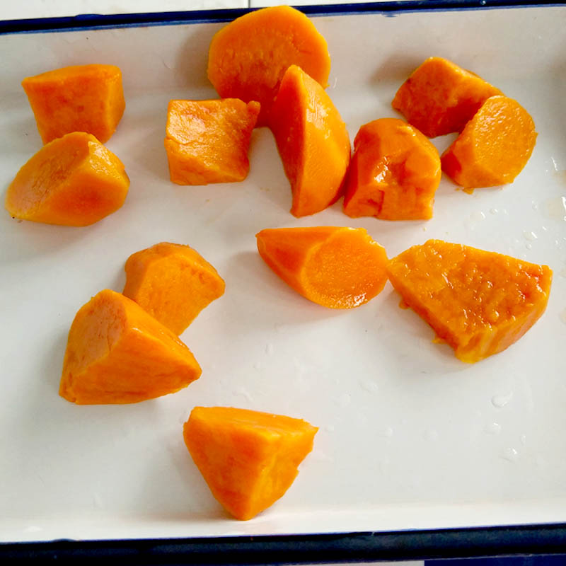 Couleur vive, jaune ou dorée typique des variétés de patates douces. La couleur dans une boîte peut légèrement varier, mais cela ne doit pas altérer l'aspect général.
